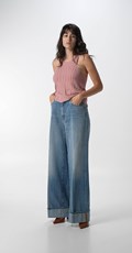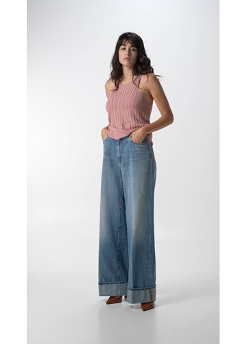 Nalaja traperice niskog struka sa širokim, opuštenim nogavicama i preklopljenim rubom. Odjevni predmet dolazi u 355 gramskom, djelomično recikliranom, čistom pamučnom, indigo traperu koji je prošao lagano enzimsko eko pranje sintetičkim plovućcem i bio-gumom te završni tretman protiv prljavštine kako bi traper izgledao iznošeno. Ovaj model s pet džepova također se može pohvaliti ručno izrađenim ogrebotinama i lokaliziranim poderotinama, što stvara dodatni kontrast na područjima nošenja. Naši ikonični šavovi u obliku galebovih krila ukrašavaju stražnje džepove, od kojih je jedan također izvezen slovom R, prepoznatljivim Replay detaljem. Zakopčavanje patentnim zatvaračem i gumbima. Dimenzija ruba: 32,5 cm. Upotreba djelomično recikliranog pamuka i održivi tretman potvrđuju Replayovu predanost ekološki prihvatljivoj modi.